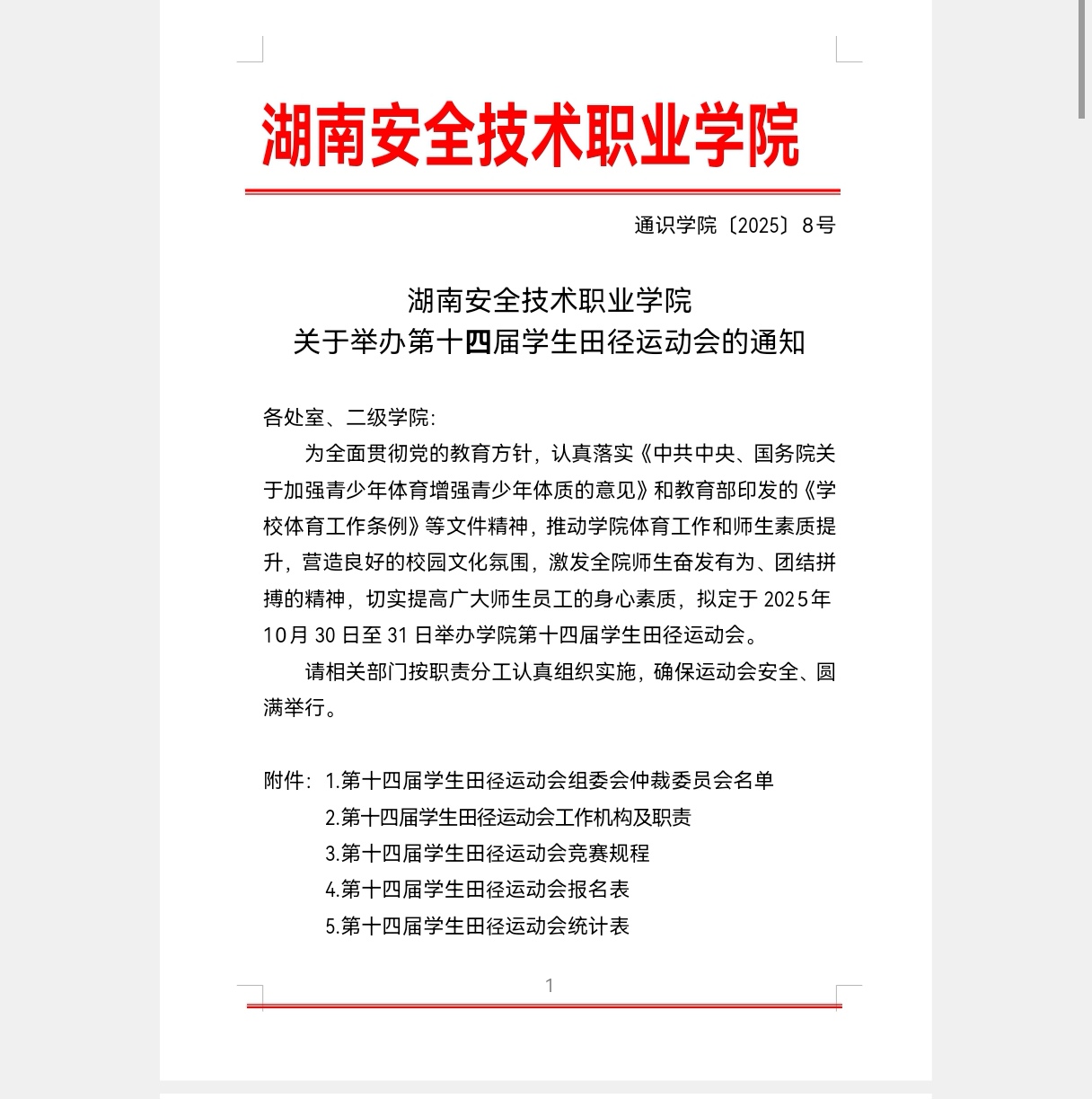 湖南安全技术职业学院关于举办第十四届学生田径运动会的通知.doc