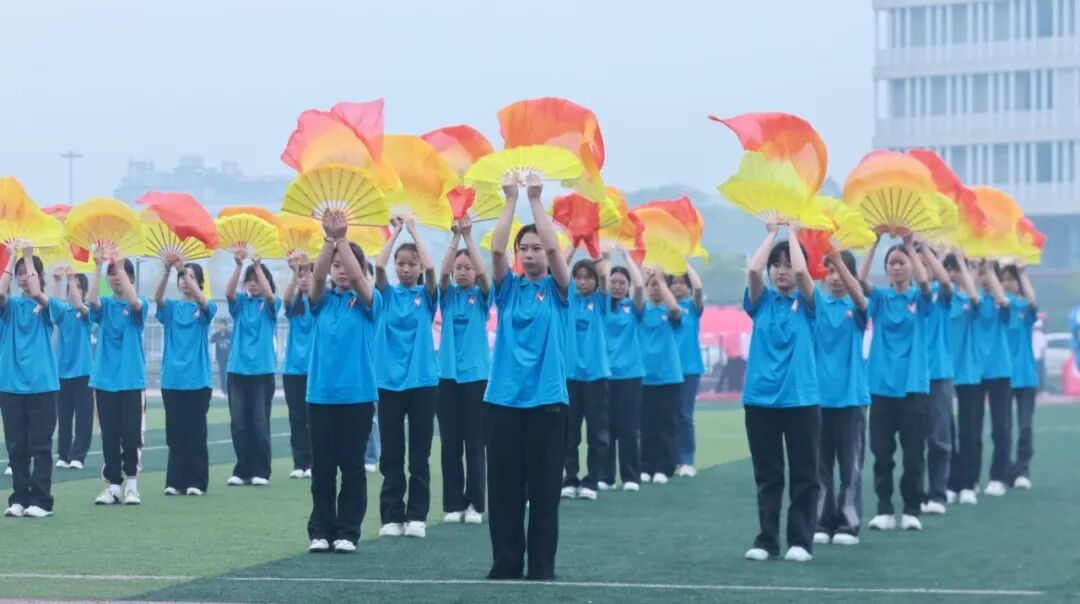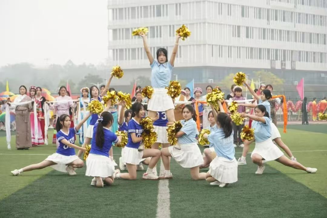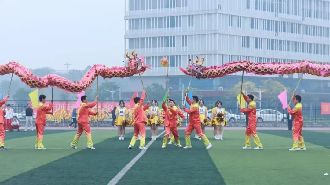 开幕式上,各二级学院献上了多元艺术盛宴,将青春活力与文化韵味交织成最动人的风景。啦啦操队伍踏着鼓点跃动入场,绚烂裙摆随利落动作划出青春弧线,每一次高抬腿、每一次集体托举,都洋溢着蓬勃朝气,瞬间点燃全场热情;舞龙队紧随其后,金黄长龙在队员默契配合下盘旋腾跃,龙珠指引间,龙身时而昂首冲天,时而俯身穿梭,传统民俗的磅礴气势在赛场之上震撼绽放;扇子舞方阵则画风一转,数十把彩扇开合间如繁花绽放,队员们舞步轻盈,扇面流转的色彩与整齐划一的队形,勾勒出古典雅致的东方之美都尽显不同民族的文化魅力。开幕式震撼而优美的场面,让全场观众沉浸式感受了多元文化的独特风采。
